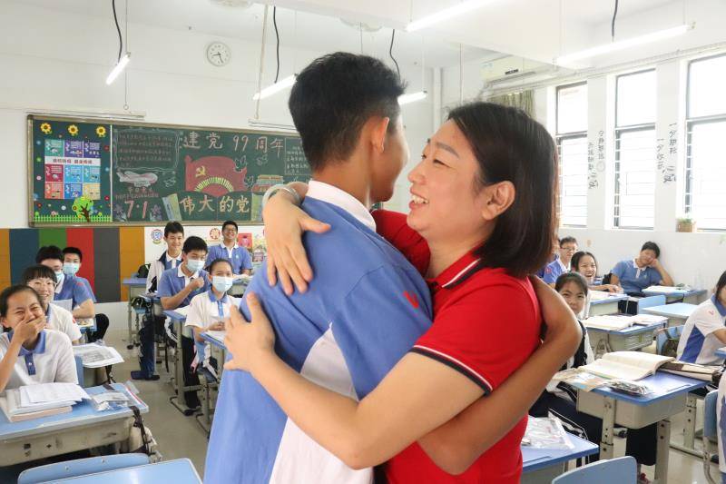 坪山同心外國(guó)語學(xué)校授課老師加油打氣:和語文老師擁抱,考試滿分! (焦子宇 耿超逸文/圖)