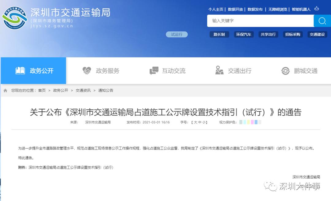 為加強(qiáng)道路管理,規(guī)范道路占用、挖掘行為,強(qiáng)化占道施工公眾監(jiān)督,深圳市交通運(yùn)輸局編制了《占道施工公示牌設(shè)置技術(shù)指引(試行)》(以下簡(jiǎn)稱《指引》),對(duì)占道施工公示牌設(shè)置要求,張貼范圍都有了明確的標(biāo)準(zhǔn)和要求。