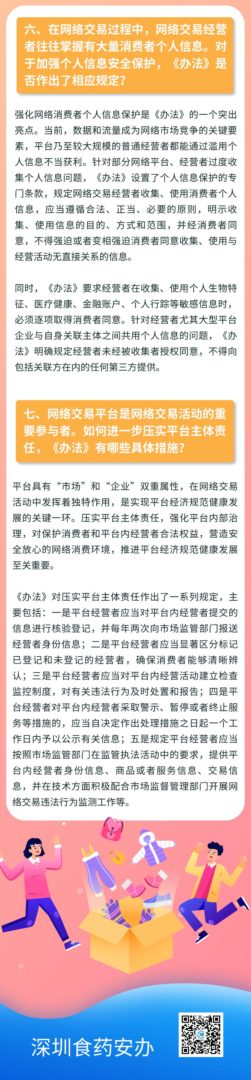 《辦法》明確了網(wǎng)絡(luò)交易監(jiān)管堅(jiān)持鼓勵創(chuàng)新、包容審慎、嚴(yán)守底線、線上線下一體化監(jiān)管原則,提出推動完善多元參與、有效協(xié)同、規(guī)范有序的網(wǎng)絡(luò)交易市場治理體系,對網(wǎng)絡(luò)經(jīng)營主體登記、新業(yè)態(tài)監(jiān)管、平臺經(jīng)營者主體責(zé)任、消費(fèi)者權(quán)益保護(hù)、個人信息保護(hù)等重點(diǎn)問題作出了明確規(guī)定。