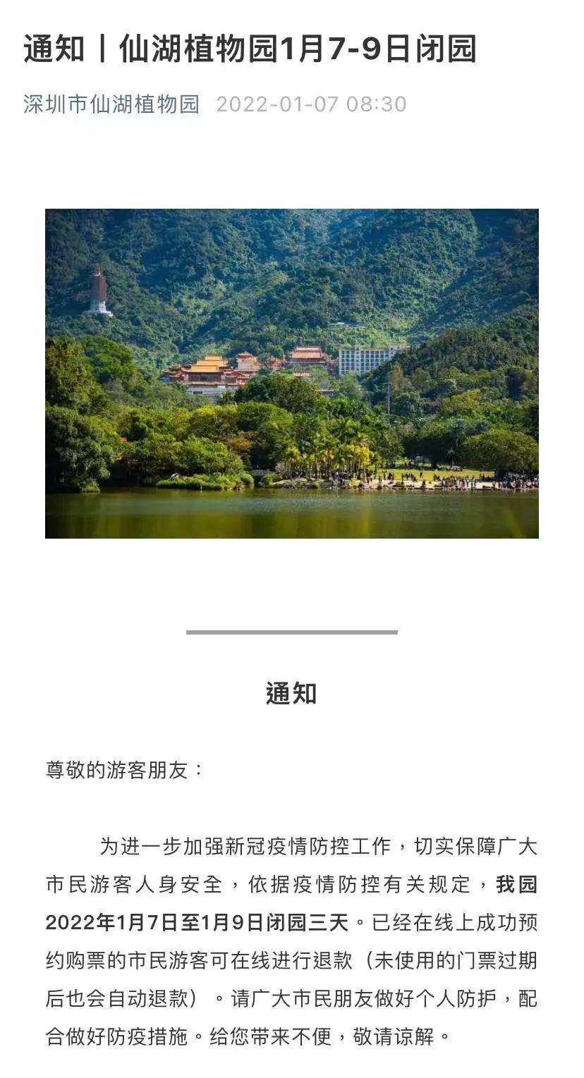 據(jù)深圳市仙湖植物園官方微信號1月7日8點30分發(fā)布的通知, 為進一步加強新冠疫情防控工作,切實保障廣大市民游客人身安全,該園1月7日至1月9日閉園3天。已經(jīng)在線上成功預約購票的市民游客可在線進行退款(未使用的門票過期后也會自動退款)。