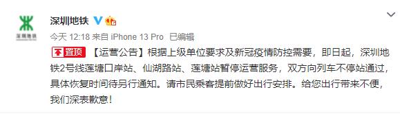 根據(jù)上級單位要求及新冠疫情防控需要,即日起,深圳地鐵2號線蓮塘口岸站、仙湖路站、蓮塘站暫停運營服務,雙方向列車不停站通過,具體恢復時間待另行通知。請市民乘客提前做好出行安排。