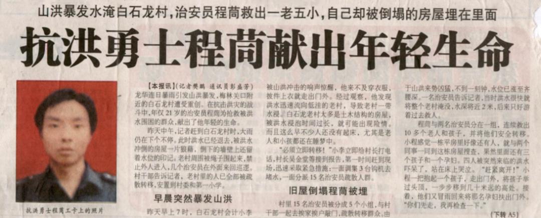 2005年8月19日至21日,深圳持續(xù)普降大到暴雨,民治街道(注:當(dāng)時為寶安區(qū)龍華街道)降雨最為集中,為幾十年一遇,引起了山洪暴發(fā)。在抗擊洪災(zāi)的戰(zhàn)斗中,年僅21歲的治安員程茼為搶救被洪水圍困的群眾不幸犧牲,獻出了他年輕的生命。