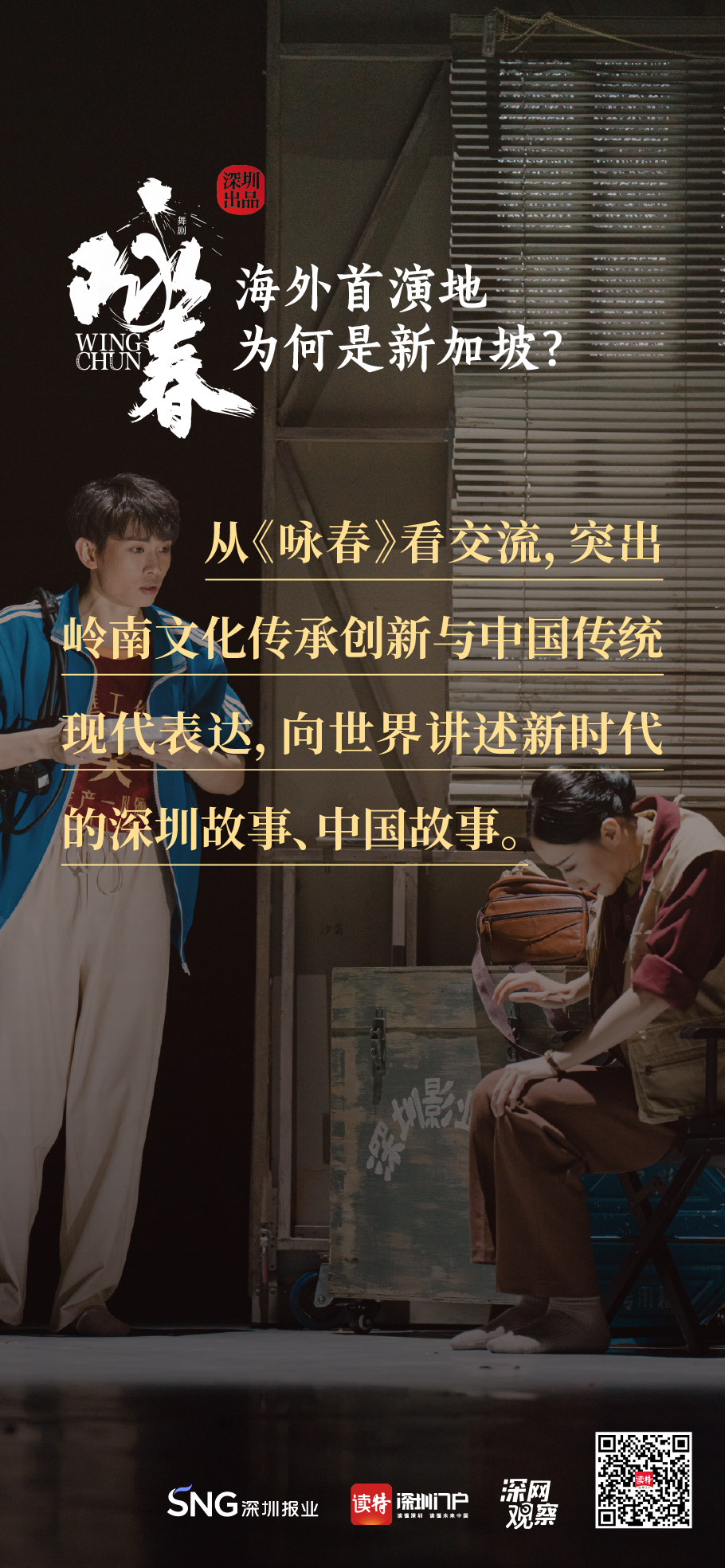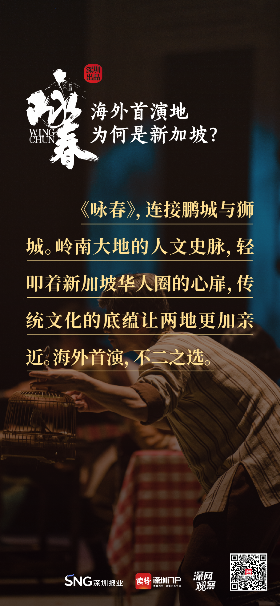 《詠春》書寫平凡英雄的傳奇,開詠春的一扇門,只為追尋心中的那一束光?!对伌骸?,連接鵬城與獅城,嶺南大地的人文史脈,輕叩著新加坡華人圈的心扉,傳統(tǒng)文化的底蘊讓兩地更加親近,海外首演,不二之選。
