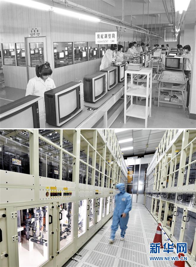拼版照片:上圖為工人在深圳華利電子有限公司彩色電視機(jī)生產(chǎn)線工作(資料照片,新華社記者李長(zhǎng)永攝);下圖為2018年6月13日,工作人員在柔宇科技首條類六代全柔性顯示屏大規(guī)模量產(chǎn)線巡檢設(shè)備狀態(tài)(新華社記者毛思倩攝)。新華社發(fā)