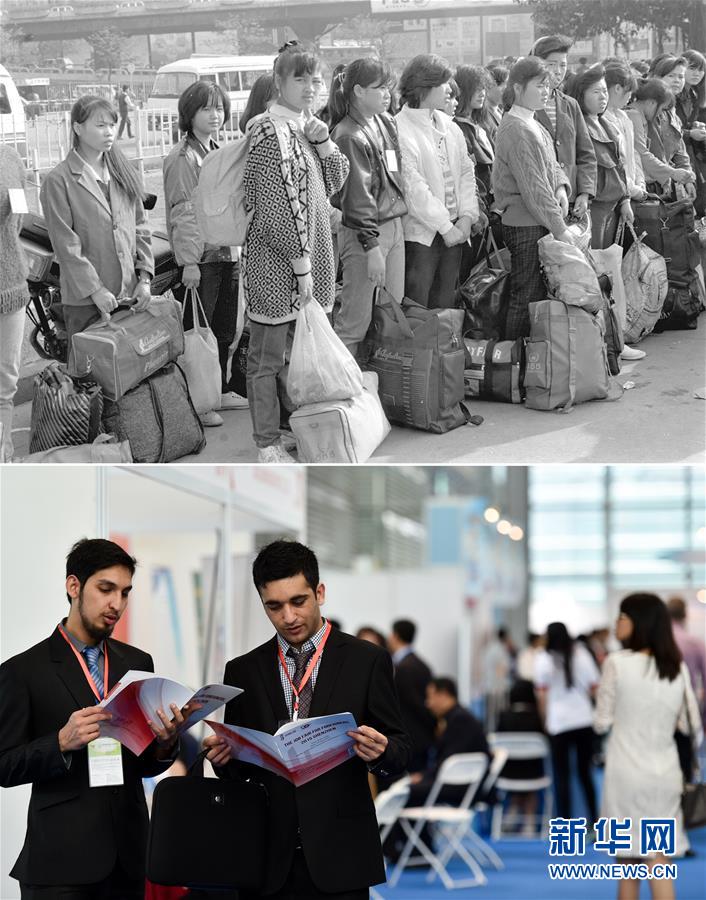 拼版照片:上圖為在深圳打工的外地務(wù)工者在火車站候車,準(zhǔn)備回家探親(資料照片,新華社記者潘家珉攝);下圖為2015年4月18日,在深圳舉行的第13屆中國(guó)國(guó)際人才交流大會(huì)上,兩位外籍應(yīng)聘者查看職位情況(新華社記者毛思倩攝)。新華社發(fā)