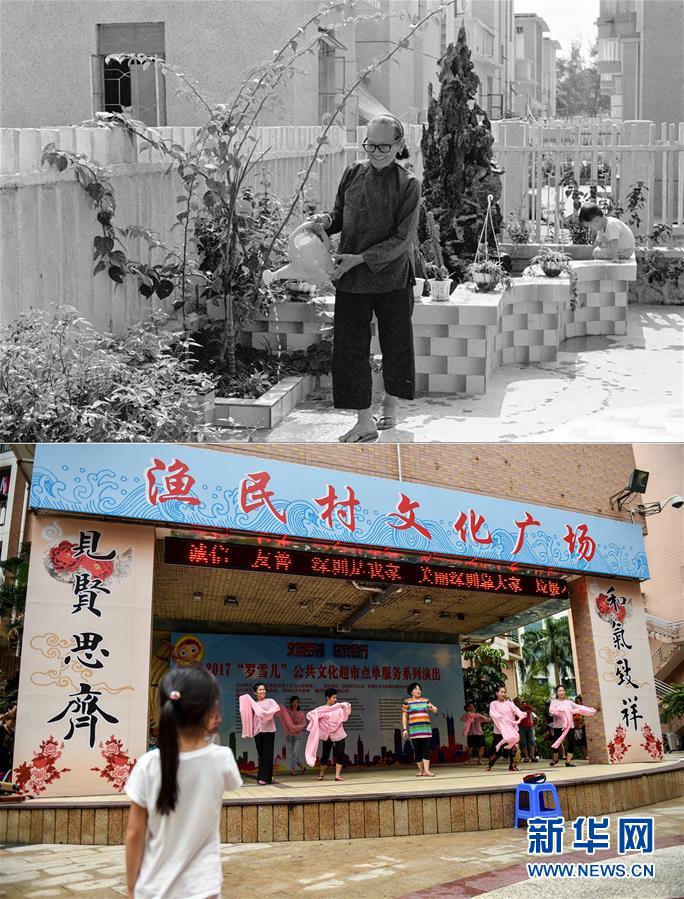 拼版照片:上圖為深圳漁民村退休老人在庭院里侍弄花木(資料照片,新華社記者潘家珉攝);下圖為2017年9月7日,漁民村的居民在社區(qū)文化廣場(chǎng)排練舞蹈(新華社記者毛思倩攝)。新華社發(fā)