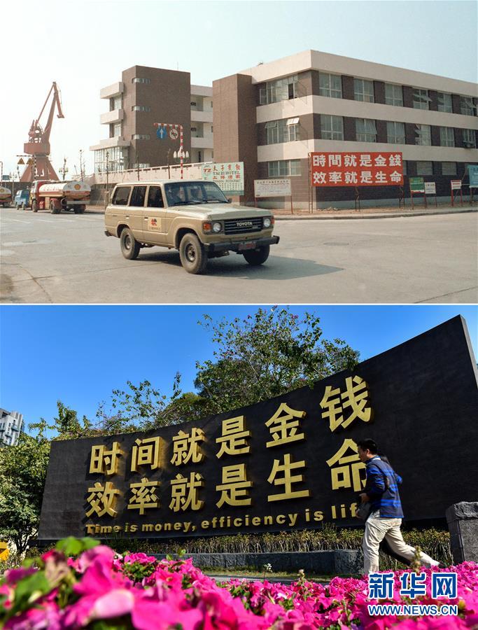 拼版照片:上圖為深圳蛇口工業(yè)區(qū)辦公大廈(資料照片,新華社記者徐佑珠攝);下圖為2015年2月24日,一名男子走過(guò)深圳蛇口時(shí)間廣場(chǎng)的“時(shí)間就是金錢,效率就是生命”牌(新華社記者毛思倩攝)。新華社發(fā)