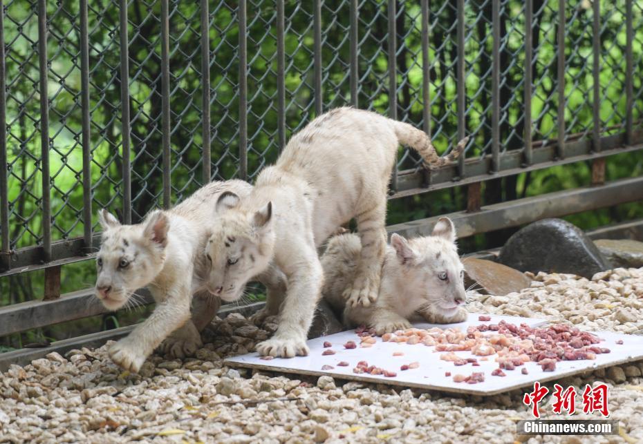 7月10日,雪虎五胞胎分享“肉餡蛋糕”。當(dāng)日,濟南野生動物世界五胞胎雪虎誕生滿百日,正式與游客見面。中新社記者 張勇攝