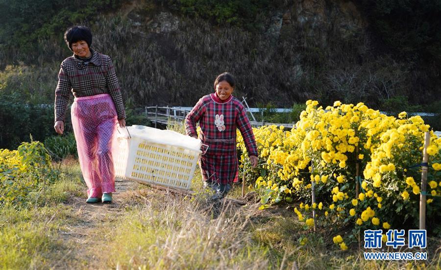 11月8日,婺源縣思口鎮(zhèn)農戶將采摘好的皇菊收到筐中準備外運。新華社記者 胡晨歡 攝