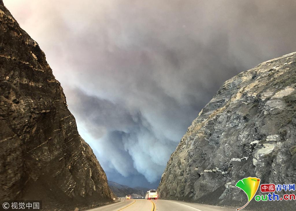 該郡第二大城市千橡樹(shù)市(Thousand Oaks)等很多地方房屋被毀,高速公路封閉,居民緊急疏散。洛杉磯郡圣蓋博市(San Gabriel)警察局警官日瓦戈(O. Zhivaga)和同事們當(dāng)天清晨即受命馳援文圖拉郡,保護(hù)當(dāng)?shù)鼐用窈拓?cái)產(chǎn)安全。圖為消防車行駛在已封閉的公路上,天空中濃煙滾滾。