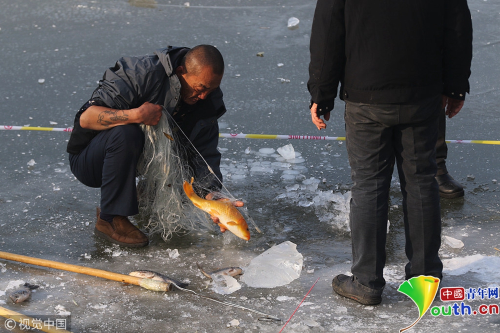 哈爾濱松花江封江 市民鑿冰捕魚