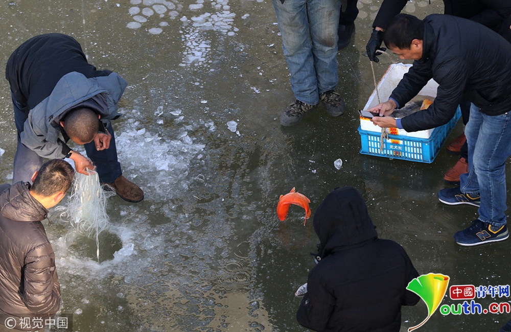 民眾鑿冰下網(wǎng)捕魚(yú)。