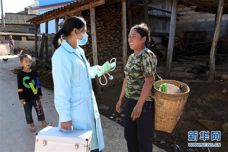 11月28日,張惠仙(中)在出診路上與一位村民交流。 新華社記者 楊宗友 攝
