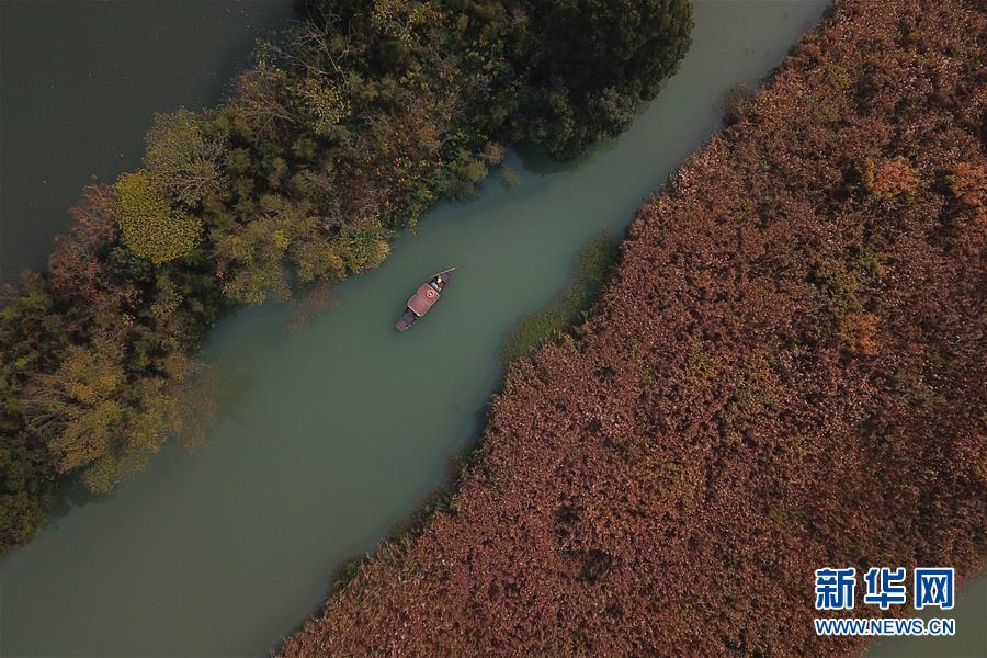 11月30日,游客乘坐搖櫓船在西溪濕地欣賞蘆花(無(wú)人機(jī)拍攝)。