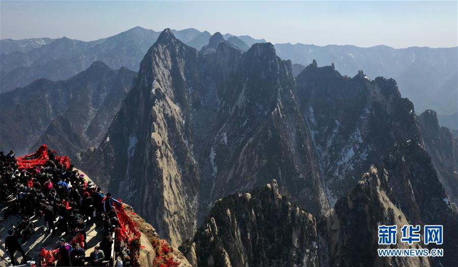 3月9日,游人在華山南峰游覽(無人機拍攝)。 隨著氣溫回升,陜西著名風景區(qū)華山進入旅游旺季。 新華社記者 陶明 攝