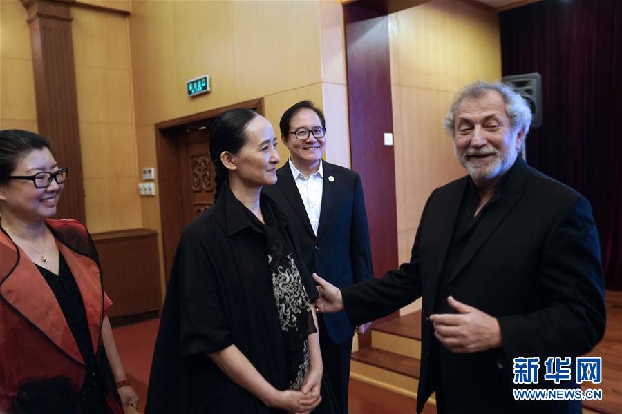 10月2日,芭蕾編舞大師鮑里斯·艾夫曼(右一)與第四屆中國(guó)國(guó)際芭蕾演出季藝術(shù)總監(jiān)馮英(左二)在演出前交流。新華社記者 金良快 攝