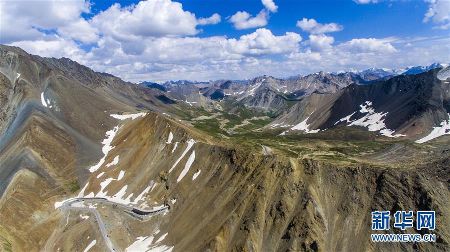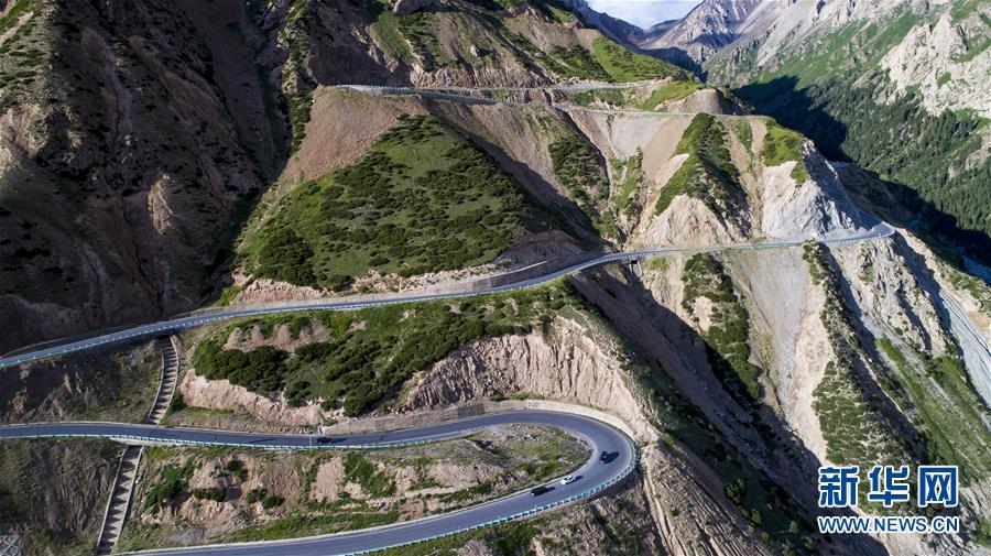 獨(dú)庫(kù)公路穿越海拔3390米的哈希勒根達(dá)坂(2017年7月13日無(wú)人機(jī)拍攝)。新華社記者江文耀攝
