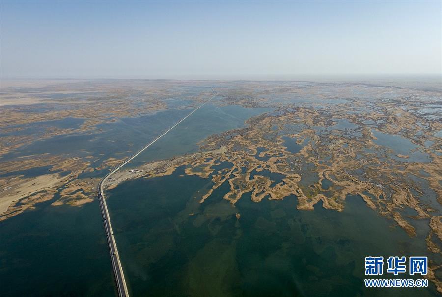 218國(guó)道在塔里木河尾閭——臺(tái)特瑪湖中間延伸(2017年10月22日無(wú)人機(jī)拍攝)。新華社記者趙戈攝