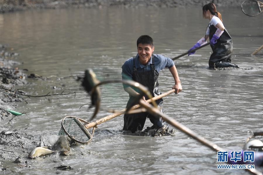 杭州:游客體驗“干塘”捕魚
