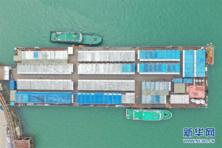 4月25日,幾名工人從海上生活區(qū)前往工地(無人機照片)。