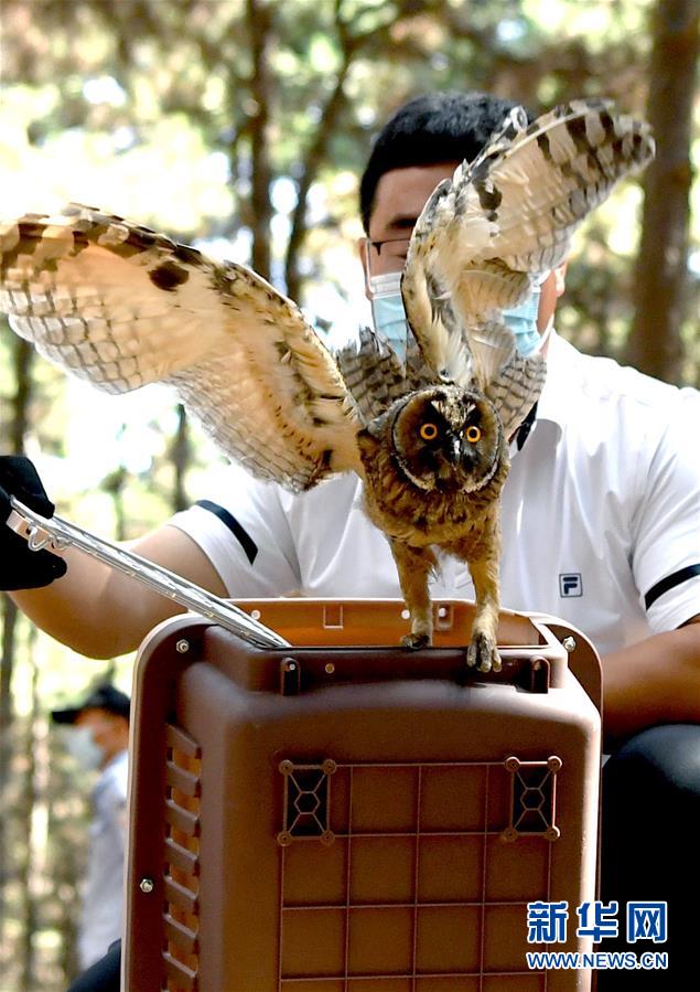 7月1日,吉林省野生動物救護(hù)繁育中心工作人員放飛一只長耳鸮。新華社記者林宏攝