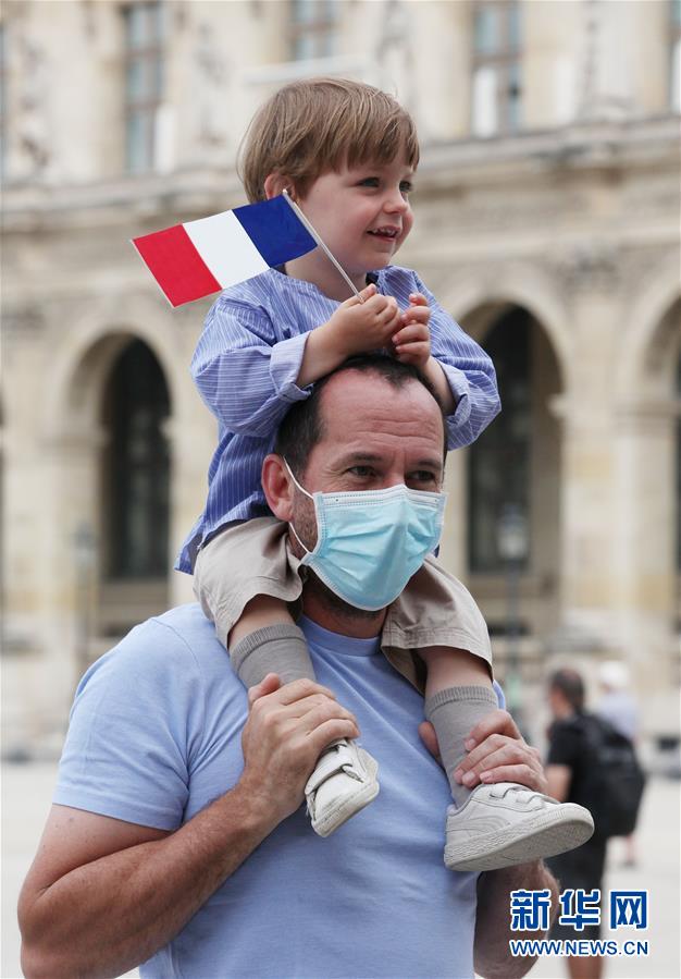 7月14日,在法國(guó)巴黎盧浮宮玻璃金字塔廣場(chǎng),一對(duì)父子觀看國(guó)慶閱兵式的飛行表演。新華社記者高靜攝