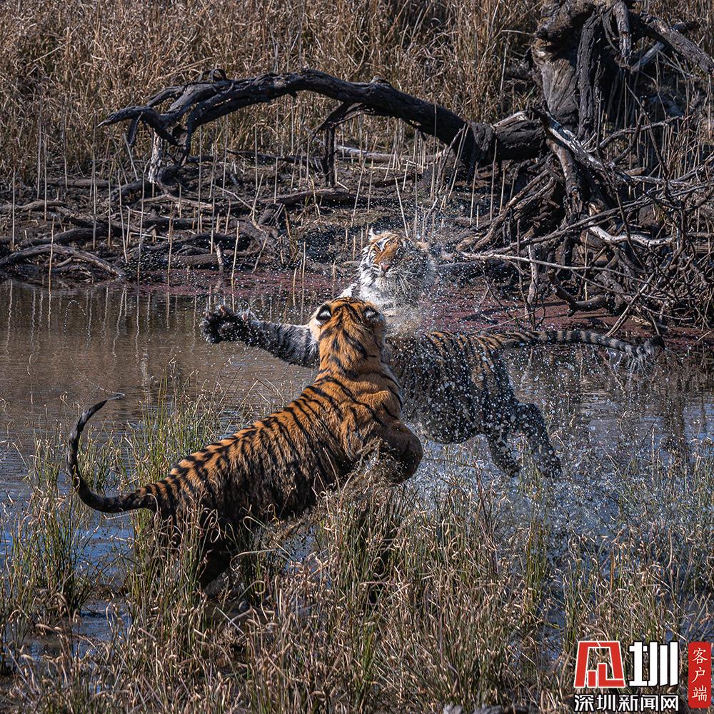 2020年7月27日,猛虎斗有多壯觀?來自印度德里的41歲職業(yè)業(yè)攝影師Nitish Madan,在在印度北部倫滕波爾國(guó)家公園游覽時(shí),見證了兩只老虎幼崽激烈的水上爭(zhēng)奪戰(zhàn)。從畫面中可以看到,兩只足足有200磅重的孟加拉虎,面對(duì)面互相咆哮,伸出虎爪兇猛至極,才15個(gè)月大就已經(jīng)有了王者風(fēng)范。