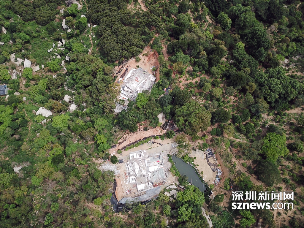 5月16日,深圳新聞網(wǎng)記者爬上羊臺山,用無人機(jī)和相機(jī)拍下羊臺山毀林案件涉案的兩棟違法建筑拆除后的情景。