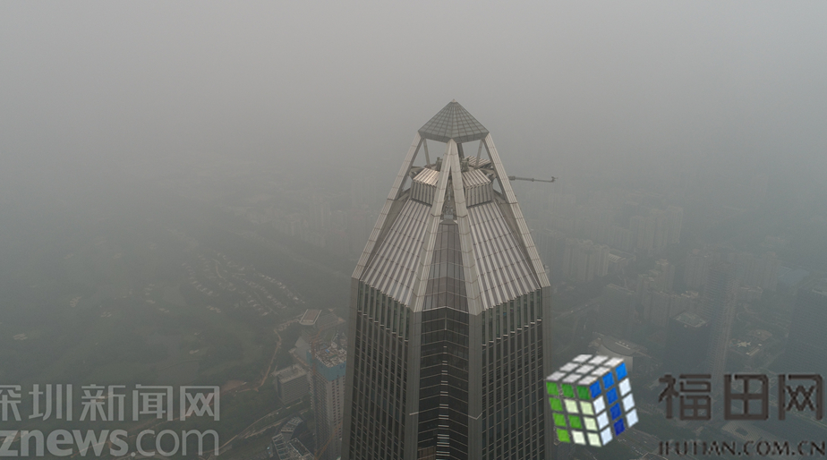 無人機(jī)航拍福田中心區(qū)的灰霾,在海拔500米左右的高空,無人機(jī)的視線就被灰霾完全擋住。