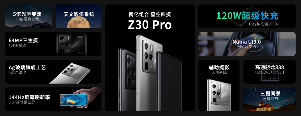 努比亞Z30 Pro將用戶需求與行業(yè)最前沿科技充分結(jié)合,打造無短板頂尖配置:搭載高通驍龍888+LPDDR5+UFS3.1頂尖性能鐵三角及行業(yè)最高的2億像素四攝組合全主攝影像系統(tǒng),獨占影像旗艦中最強的120W超級快充與144 Hz超高刷新率,并將全新升級的UI交互系統(tǒng)和更加強悍易用的影像功能融于一身,貫徹科技、藝術(shù)與用戶需求完美融合的平衡之道。全新一代努比亞Z系列旗艦——Z30 Pro攜星光而來。