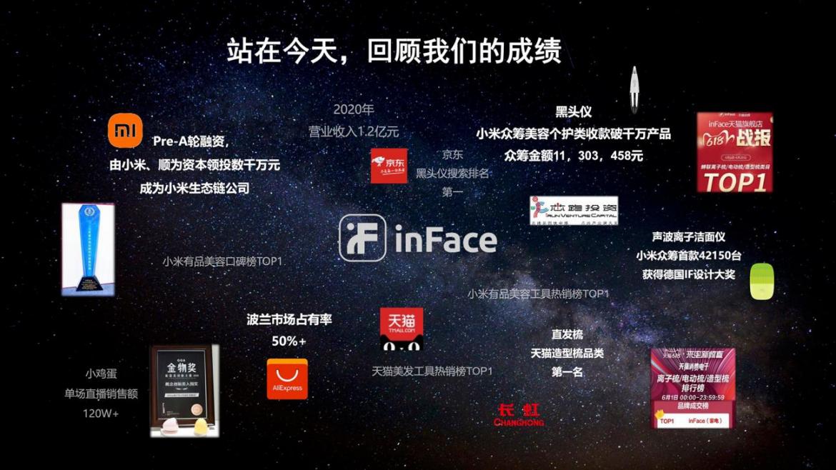 據(jù)了解, inFace創(chuàng)立于2017年6月21日,經(jīng)過近1年籌備,2018-2020年完成了第一個“三年計劃”,即實現(xiàn)成為行業(yè)有代表和開創(chuàng)性“產(chǎn)品型公司”的戰(zhàn)略目標。在這期間,inFace發(fā)布原創(chuàng)產(chǎn)品12款+,年營收超1億元,同時完成由小米集團、順為資本領投的數(shù)千萬元Pre-A輪融資,正式加入小米生態(tài)鏈。在小米有品、天貓和京東等國內(nèi)主流電商平臺上,核心類目例如潔面儀、黑頭儀、直發(fā)梳、美膚儀和美容儀等產(chǎn)品,inFace都是TOP級商家。