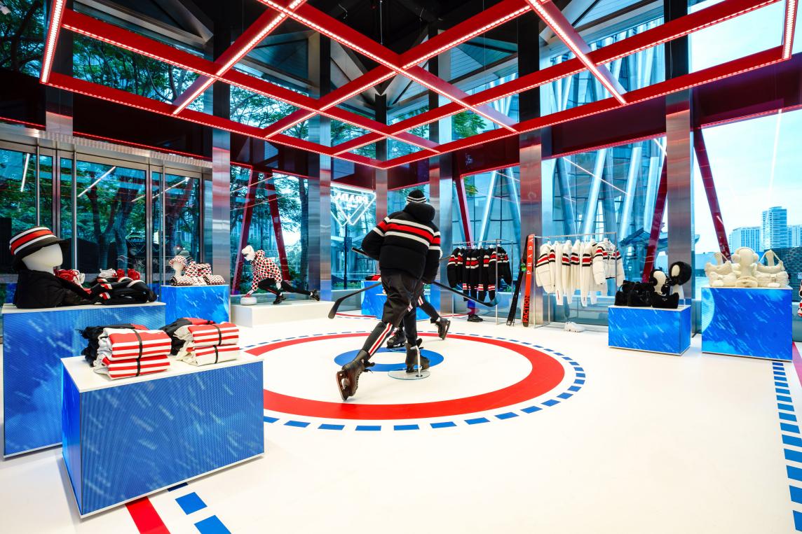 據(jù)了解,全新“冰上普拉達(dá)”限時(shí)店在深圳灣萬象城亮相,從冰球場線條得到靈感的活力紅藍(lán)圖案鋪陳于雪白地面,用臺階元素進(jìn)行定義,同時(shí),形似記分牌的紅色 LED燈條滾動顯示Prada徽標(biāo)。體育賽場的看臺搖身變成顧客活動區(qū),雪橇平臺化作展示臺,擺出經(jīng)典運(yùn)動姿態(tài)的人體模特成為全場焦點(diǎn)。