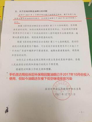 據(jù)悉,該市民在2017年已在信訪局上針對(duì)低層油煙管道對(duì)居民區(qū)排放油煙的問(wèn)題進(jìn)行投訴,當(dāng)年12月1日得到了深圳市羅湖區(qū)環(huán)境保護(hù)與水務(wù)局的回復(fù),稱羅湖區(qū)環(huán)水局已于2017年1月對(duì)相關(guān)低空排放油煙的餐廳提出了要將油煙高空排放的要求,餐廳安裝的高空煙管也已于2017年10月正式投入使用。