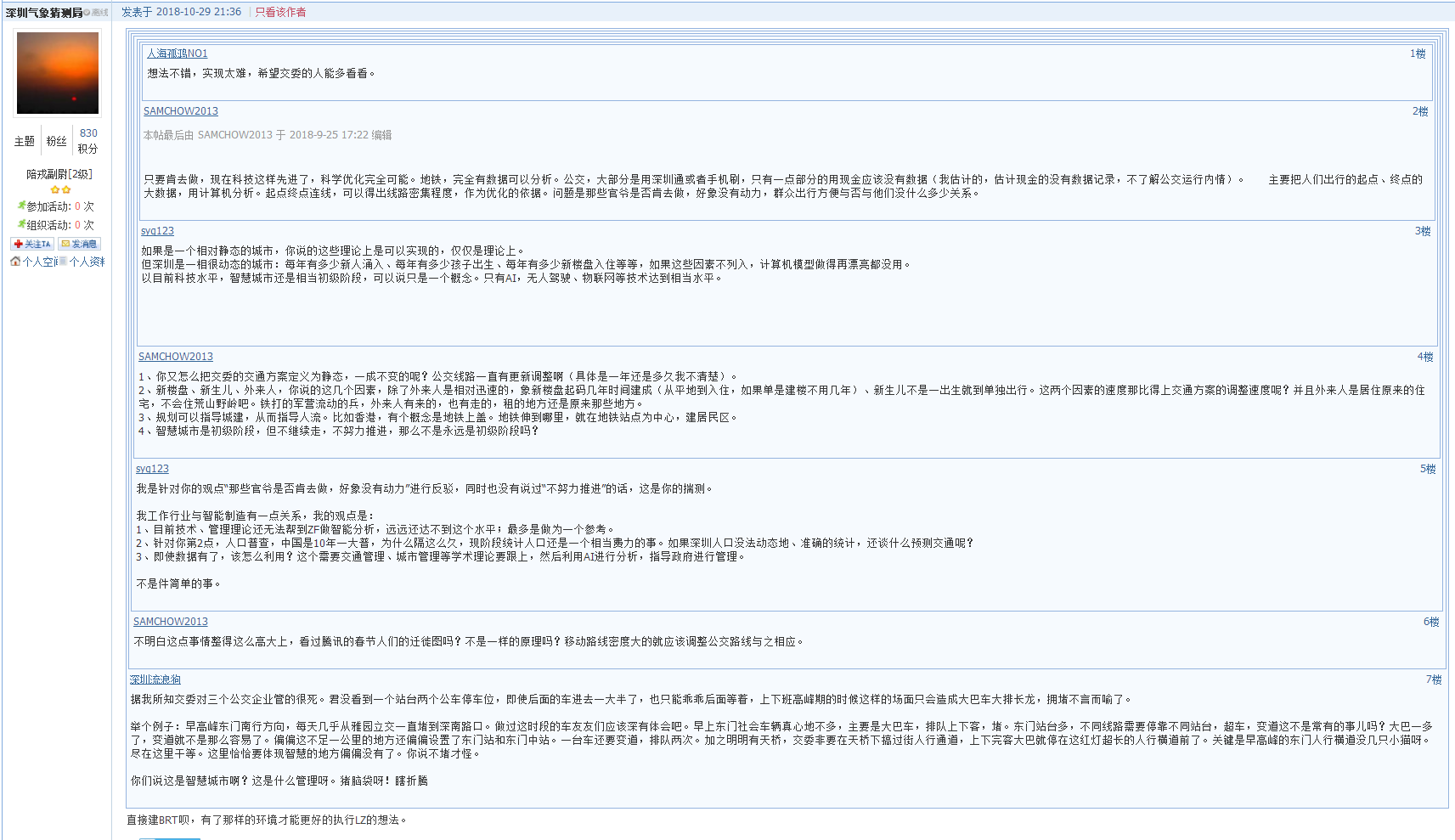 9月25日有市民在深圳論壇以《關于公交線路規(guī)劃和站臺設置的一點建議》為題發(fā)帖,自稱是曾經(jīng)的公交人和現(xiàn)在的私家車駕駛員,對深圳的公交出行一口氣提出3個意見。帖文中最為吸引人眼球的觀點就是“將全市各站點進行編號,采用計算機技術,對編號站點進行排列組合,每個方向連續(xù)的10個站點有三條線路覆蓋,超出三條屬于線路密度高或規(guī)劃不合理?!眴芜@一句話就在跟帖中引發(fā)了針鋒相對的辯論,有支持的市民認為:主意不錯,實現(xiàn)起來應該也難度不大。現(xiàn)在不是整天提什么物聯(lián)網(wǎng)、大數(shù)據(jù)、智慧城市么,這個不就是這些高新技術在公交出行方面的應用。不看好的市民則認為:目前技術、管理理論還無法做智能分析,遠遠還達不到這個水平,“最多是做為一個參考”。