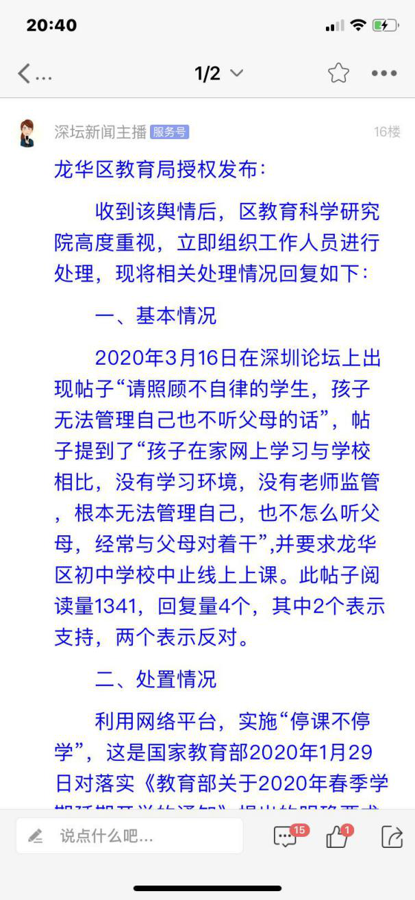 見(jiàn)圳客戶端·深圳新聞網(wǎng)3月25日訊 (見(jiàn)圳客戶端、深圳新聞網(wǎng)記者 譚銘碩)受疫情影響,深圳各中小學(xué)首次采用線上開(kāi)學(xué)的方式,做到"停課不停學(xué)"。此舉讓很多深圳家長(zhǎng)都積攢了一肚子的話,比如這位家長(zhǎng),就在問(wèn)政深圳平臺(tái)建議龍華區(qū)終止初中網(wǎng)課,而理由居然是:"自己不在孩子身邊,孩子平時(shí)也不聽(tīng)父母的話,還與父母對(duì)著干。孩子不自覺(jué)不自律導(dǎo)致在家學(xué)習(xí)效率低下?!贬槍?duì)市民提出的問(wèn)題,龍華區(qū)教育局在深圳論壇作出了公開(kāi)回應(yīng)。