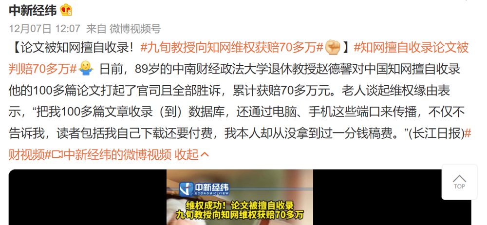 中南財(cái)經(jīng)政法大學(xué)退休教授蘇少之,趙德鑫教授的學(xué)生,后來(lái)以同樣的方式打官司并勝訴。維權(quán)成功后,蘇少之的論文也被中國(guó)知網(wǎng)下架了。有網(wǎng)友點(diǎn)評(píng)一針見(jiàn)血:中國(guó)知網(wǎng)是不是該把所有教授的賬都結(jié)一下?