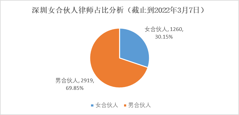 截至2022年3月7日,深圳律所共有注冊合伙人律師4179人,其中女合伙人律師1260人,占總合伙人數(shù)的30.15%。