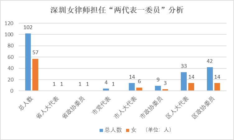 截至2021年底,深圳律師中有102名“兩代表一委員”,其中女律師57人,占55.88%。