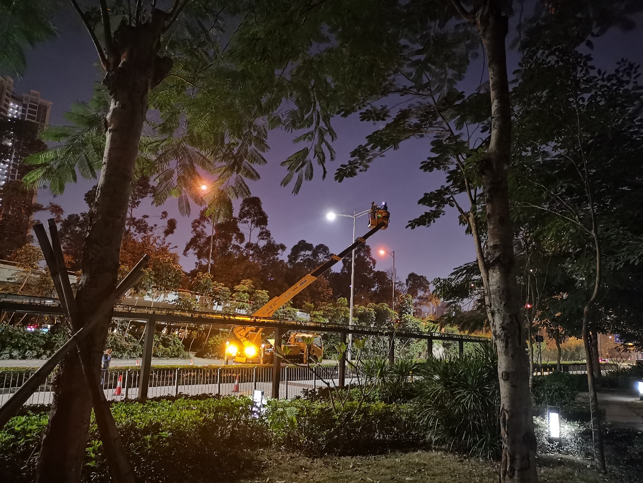 身穿深圳照明馬甲的工作人員正在對路燈進行維修更換(11月25日攝)