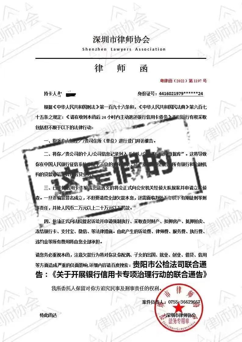 讀特客戶端·深圳新聞網(wǎng)2022年10月10日訊(記者 翁任瑩 張玲)近日,有人假冒“深圳市律師協(xié)會”名義發(fā)出催收信用卡債務(wù)的所謂“律師函”,并蓋上“深圳市律師協(xié)會”法務(wù)專用章。