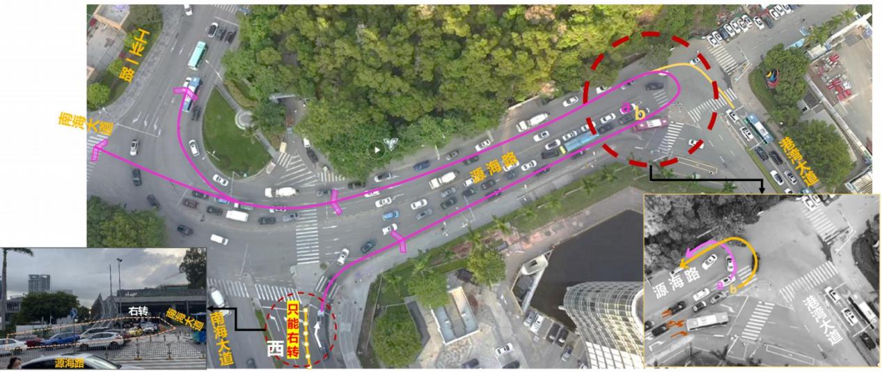 南山區(qū)南海大道時間廣場路段是通往蛇口、前海的重要道路,早晚高峰期車流量較大。修地鐵時在南海大道做了“布袋口臨時設(shè)施”,南海大道現(xiàn)已經(jīng)恢復(fù)通車,但因臨時設(shè)施還未及時拆掉,路口紅綠燈沒有啟用。加之車道收窄,原本可以快速左轉(zhuǎn)北行的車流被擠成一條右轉(zhuǎn)車道,再擠到老碼頭掉頭,四車道變一車道,導(dǎo)致高峰期多數(shù)車輛爭搶道,既不安全還加劇了擁堵。
