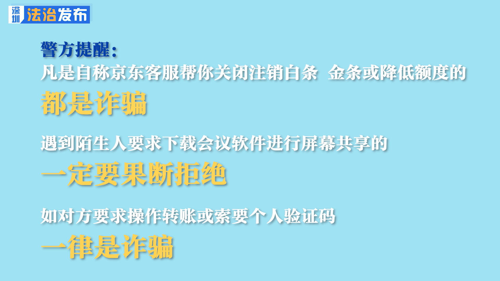 凡是自稱京東客服幫你關(guān)閉注銷(xiāo)白條、金條,或降低額度的,都是詐騙;