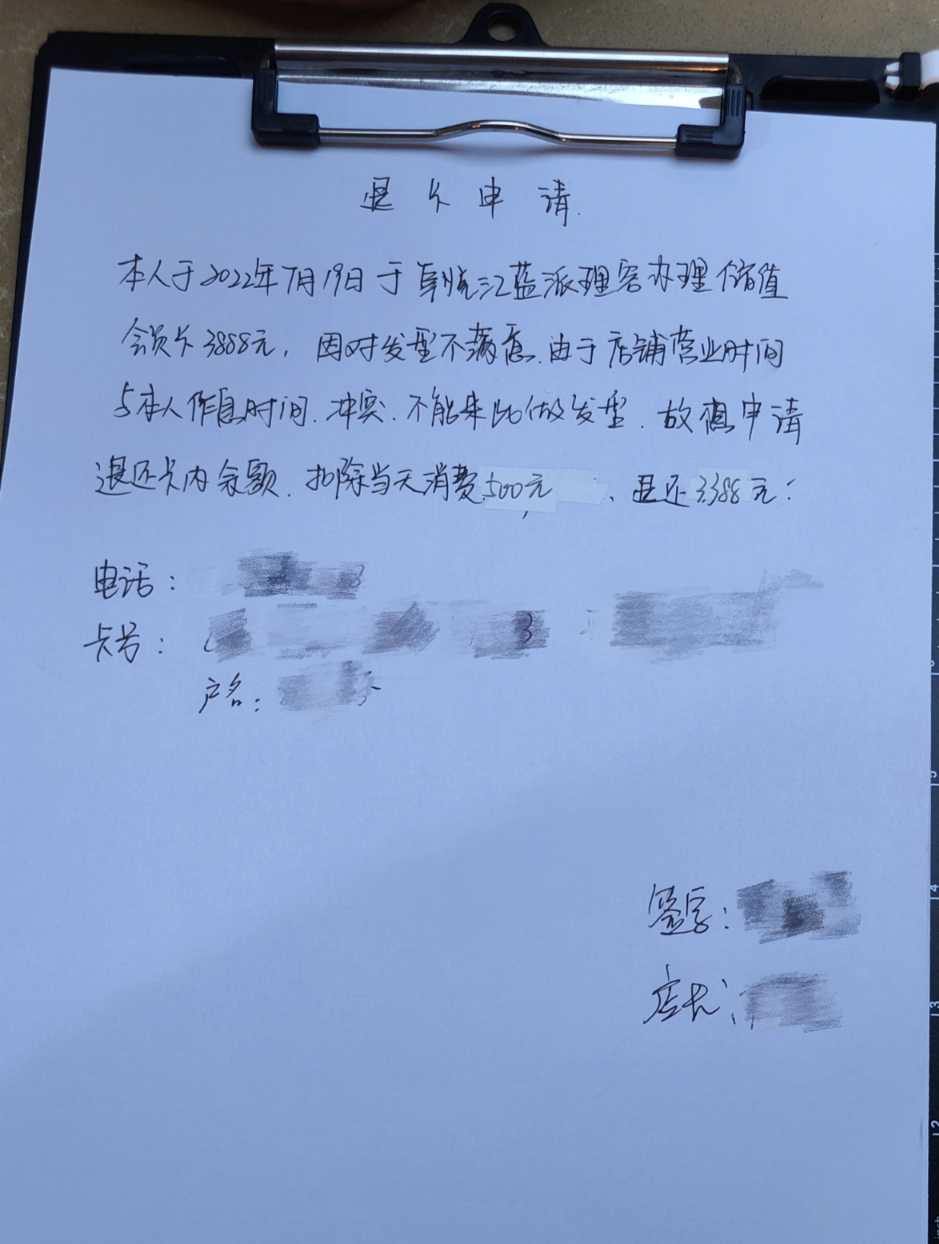 本人于2022年7月19日在該商家處花費3888元充值會員卡,后因?qū)Πl(fā)型不滿意及店鋪營業(yè)時間與本人作息時間沖突,故申請退還卡內(nèi)余額。商家于2023年4月25日同意在5個工作日內(nèi)退款,但一直拖延,至今仍未退款。