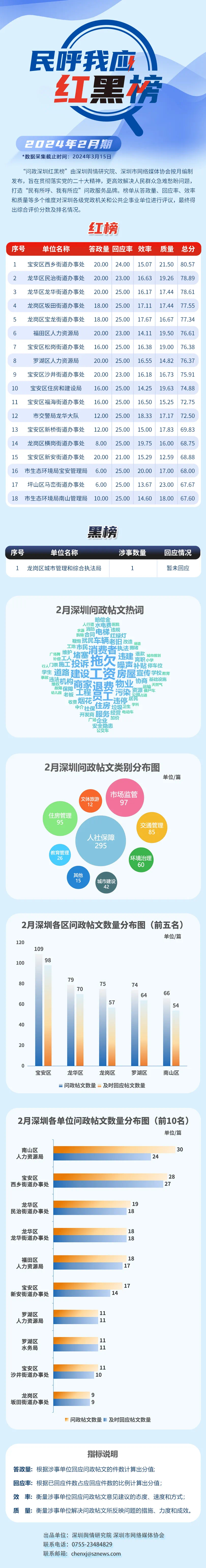 本期榜單采集的帖文主要來自深圳論壇、深圳各區(qū)政府官網(wǎng)、人民網(wǎng)領(lǐng)導(dǎo)留言板及深圳新聞網(wǎng)“民呼我應(yīng)”等平臺,所采集帖文發(fā)布時(shí)間為2024年2月1日至2月29日,采集截止時(shí)間為2024年3月15日。榜單具有科學(xué)、合理、完備的綜合評價(jià)體系,能夠從答政量、回應(yīng)率、效率和質(zhì)量等多個(gè)維度對深圳各級黨政機(jī)關(guān)和公共企事業(yè)單位進(jìn)行評議。