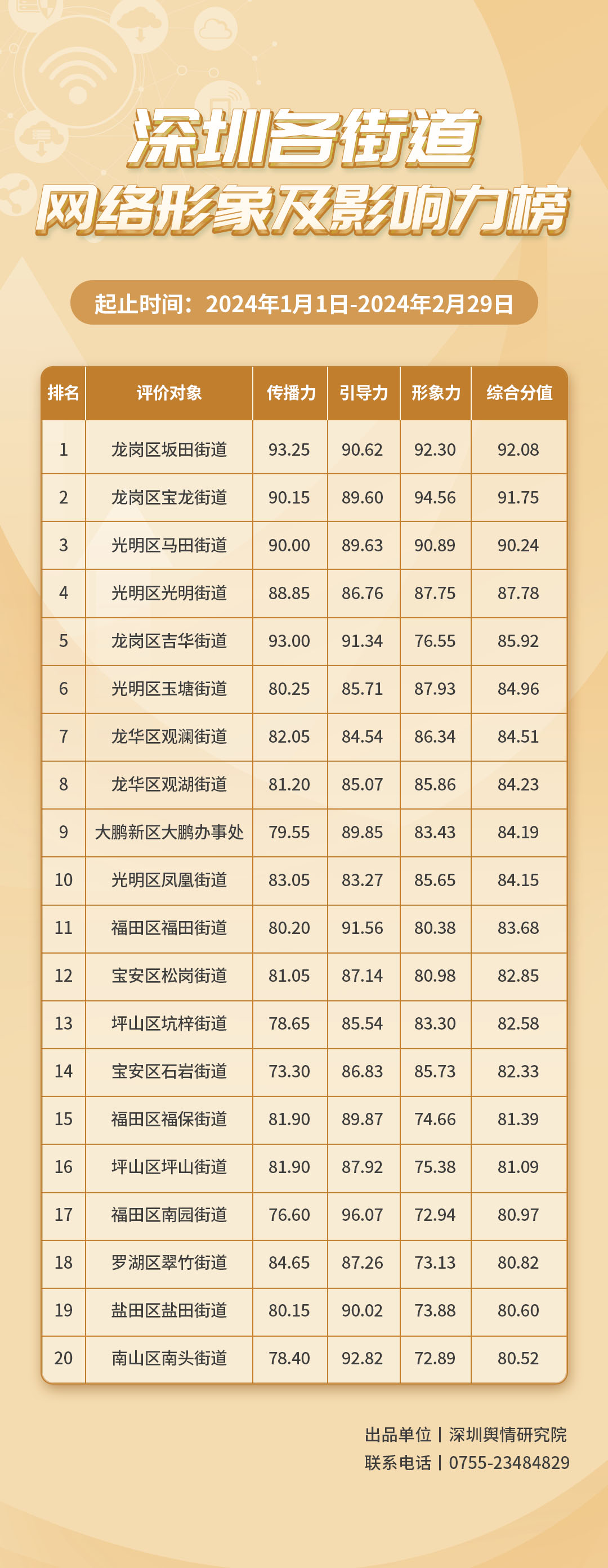 《深圳各街道網(wǎng)絡(luò)形象及影響力榜》從深圳各街道的傳播力(100分)、引導(dǎo)力(100分)、形象力(100分)三個維度展開綜合評價、計分排名,最終形成榜單。