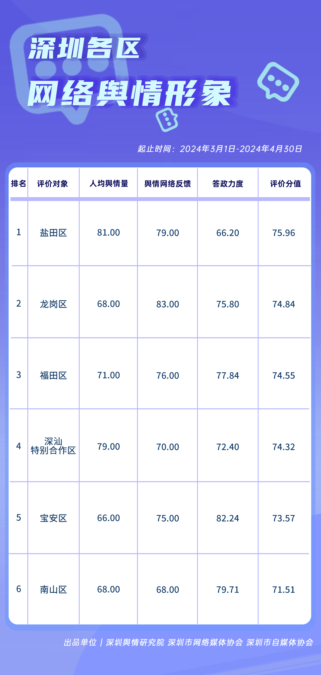 3-4月,福田區(qū)、龍崗區(qū)、南山區(qū)、鹽田區(qū)、大鵬新區(qū)、深汕特別合作區(qū)的網(wǎng)絡(luò)形象建設(shè)工作頗具成效,依次登上《深圳各區(qū)網(wǎng)絡(luò)形象建設(shè)榜》。其中,福田區(qū)榮登榜首,綜合形象得分為81.95分,且新媒體傳播形象得分達(dá)96.33分,展現(xiàn)出其以新媒體形象塑造為著力點(diǎn),推進(jìn)綜合網(wǎng)絡(luò)形象建設(shè)工作的一面。緊隨其后的是龍崗區(qū),綜合形象得分接近80分,整體表現(xiàn)領(lǐng)先于其他多區(qū),說(shuō)明龍崗區(qū)在完善基層治理體系、維護(hù)良好網(wǎng)絡(luò)口碑等方面作出了較大努力。居于榜單第三至六名的南山區(qū)、鹽田區(qū)、大鵬新區(qū)和深汕特別合作區(qū),在網(wǎng)絡(luò)形象建立及優(yōu)化方面也具有可圈可點(diǎn)的表現(xiàn),如鹽田區(qū)積極完善民生保障制度,賦能群眾美好生活,提升群眾的社會(huì)生活滿意度,南山區(qū)則借力政務(wù)新媒體矩陣,持續(xù)深化政務(wù)信息傳播工作,擴(kuò)大新媒體矩陣影響力。