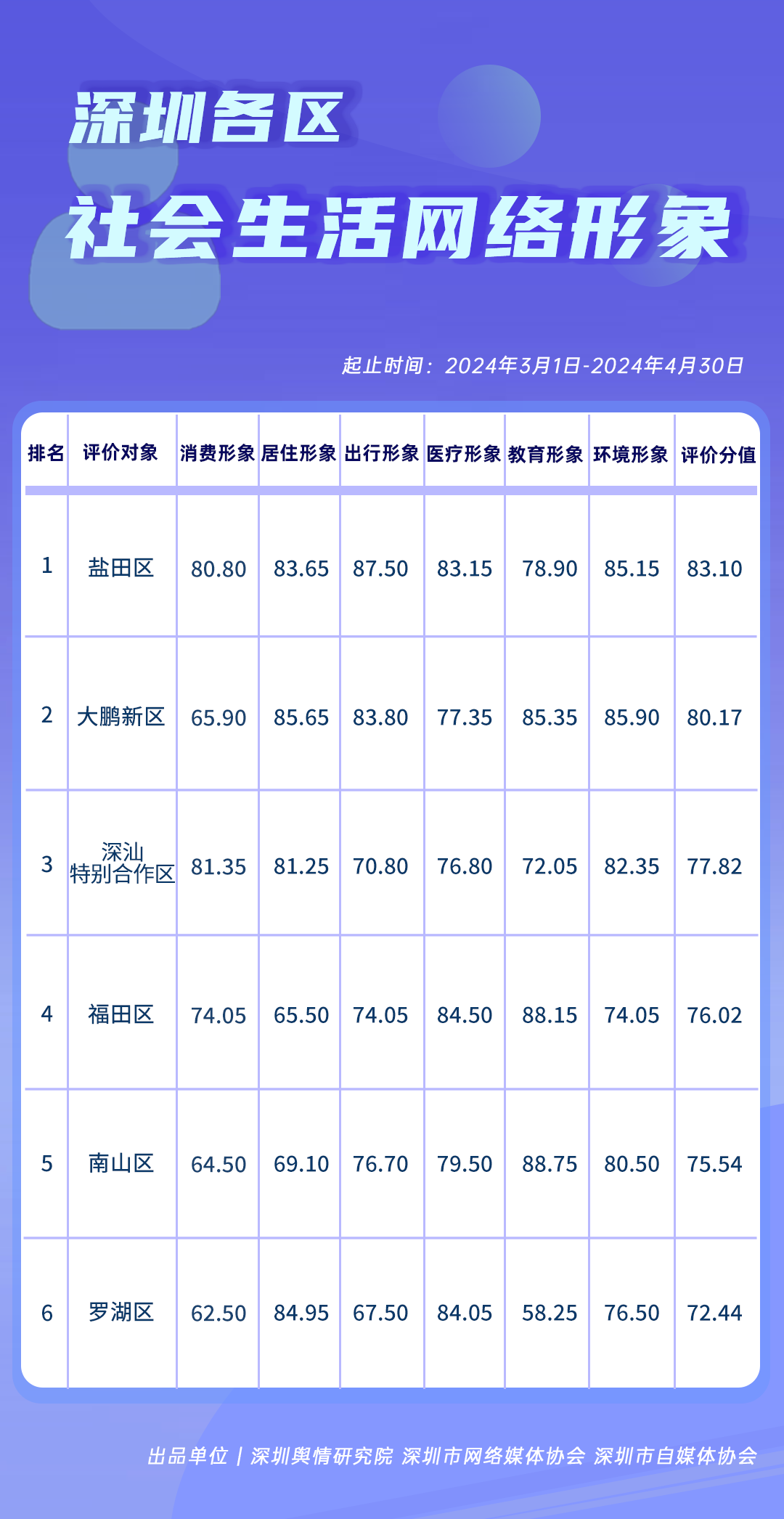 3-4月《深圳各區(qū)社會(huì)生活網(wǎng)絡(luò)形象榜》顯示,位居榜單第一名的鹽田區(qū),評(píng)價(jià)分值為83.10分,且消費(fèi)、居住、出行、醫(yī)療和環(huán)境形象方面均高于80分,整體社會(huì)生活網(wǎng)絡(luò)形象較佳。緊隨其后的大鵬新區(qū)在居住、教育和環(huán)境形象建設(shè)方面,取得的分?jǐn)?shù)都高于85分,表明該區(qū)在打造優(yōu)美宜居生活環(huán)境過(guò)程中收獲了較好反饋。位列第三的深汕特別合作區(qū),在消費(fèi)、居住、環(huán)境形象方面表現(xiàn)也相對(duì)較好,得分均在80分以上,助推其社會(huì)生活網(wǎng)絡(luò)形象綜合得分走高。福田區(qū)、南山區(qū)、羅湖區(qū)分別占據(jù)了榜單第四,第五和第六的位置,評(píng)價(jià)分值依次為76.02分、75.54分、72.44分,綜合水平良好,后續(xù)若能充分發(fā)揮優(yōu)勢(shì),著力補(bǔ)齊短板,排名有望持續(xù)提升。