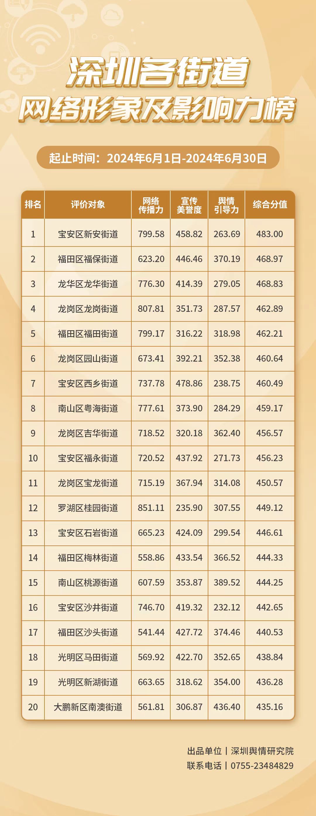 2024年6月,共有20個街道登上《深圳各街道網(wǎng)絡(luò)形象及影響力榜》,分別是:寶安區(qū)新安街道、福田區(qū)福保街道、龍華區(qū)龍華街道、龍崗區(qū)龍崗街道、福田區(qū)福田街道、龍崗區(qū)園山街道、寶安區(qū)西鄉(xiāng)街道、南山區(qū)粵海街道、龍崗區(qū)吉華街道、寶安區(qū)福永街道、龍崗區(qū)寶龍街道、羅湖區(qū)桂園街道、寶安區(qū)石巖街道、福田區(qū)梅林街道、南山區(qū)桃源街道、寶安區(qū)沙井街道、福田區(qū)沙頭街道、光明區(qū)馬田街道、光明區(qū)新湖街道、大鵬新區(qū)南澳街道。