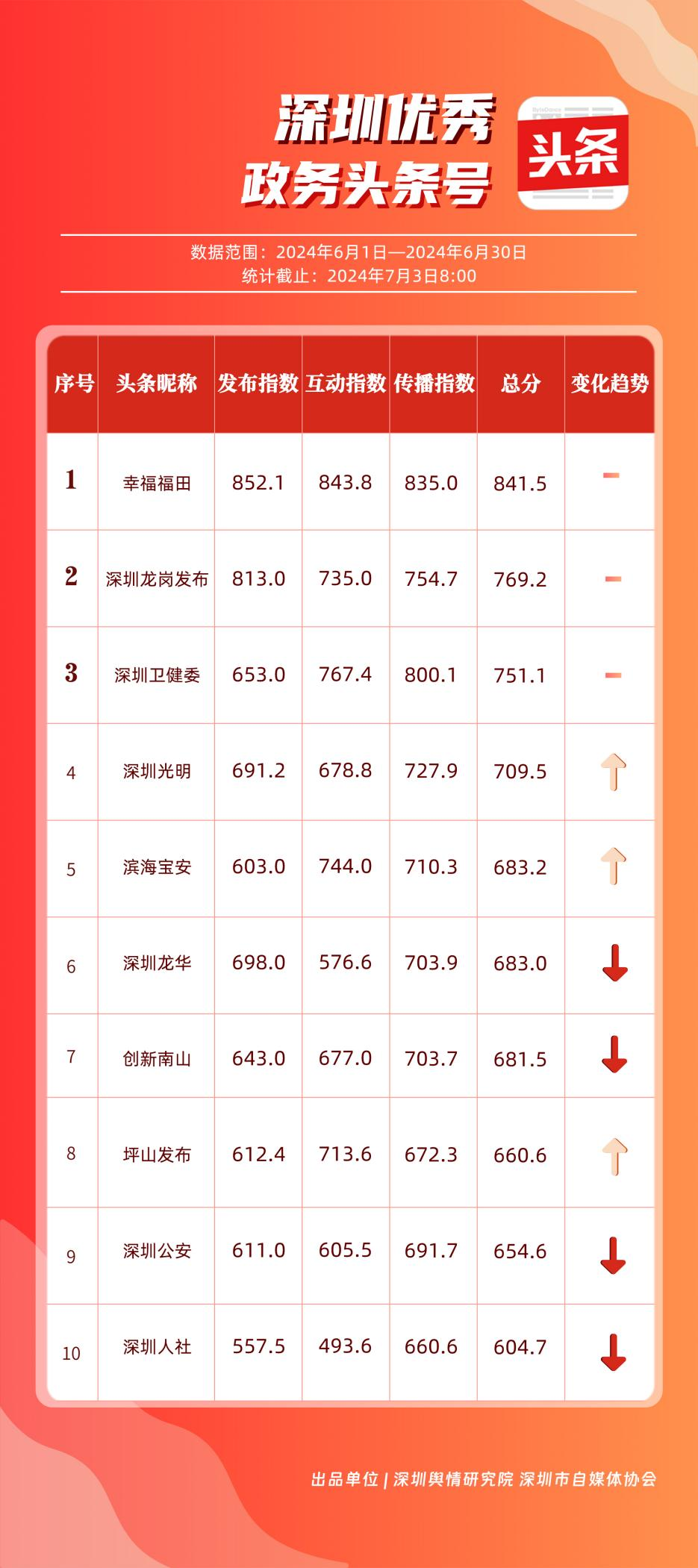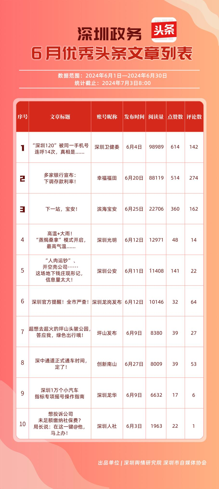 6月,“幸福福田”“深圳龍崗發(fā)布”“深圳衛(wèi)健委”“深圳光明”“濱海寶安”“深圳龍華”“創(chuàng)新南山”“坪山發(fā)布”“深圳公安”“深圳人社”共10個(gè)政務(wù)頭條號能夠及時(shí)發(fā)布政務(wù)信息及公共服務(wù)信息,入列“優(yōu)秀政務(wù)頭條號”榜單。從數(shù)據(jù)上分析,《“深圳120”被同一手機(jī)號連呼14次,真相是……》《多家銀行宣布:下調(diào)存款利率!》《下一站,寶安!》等優(yōu)秀文章為網(wǎng)民提供醫(yī)療急救、經(jīng)濟(jì)政策、區(qū)域發(fā)展等領(lǐng)域的信息,發(fā)揮各自賬號在信息傳播、公共服務(wù)等方面的重要功能,收獲較高點(diǎn)贊。