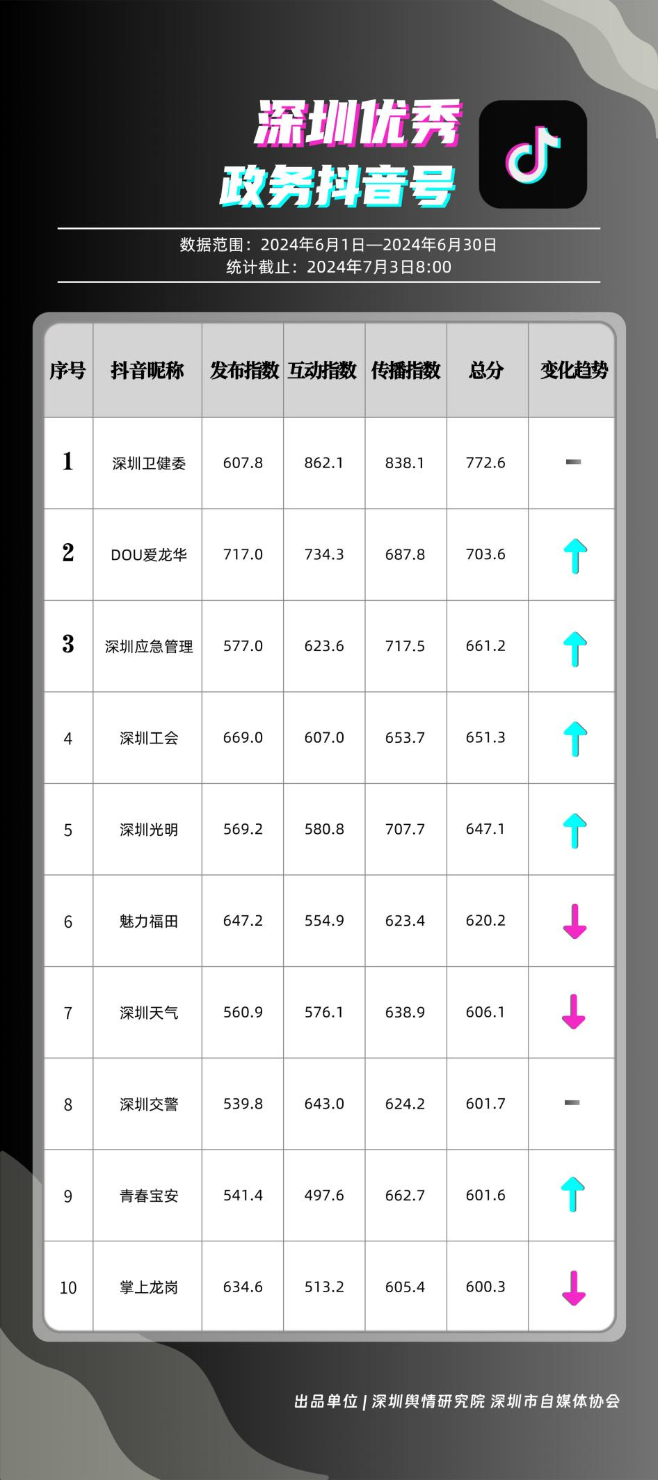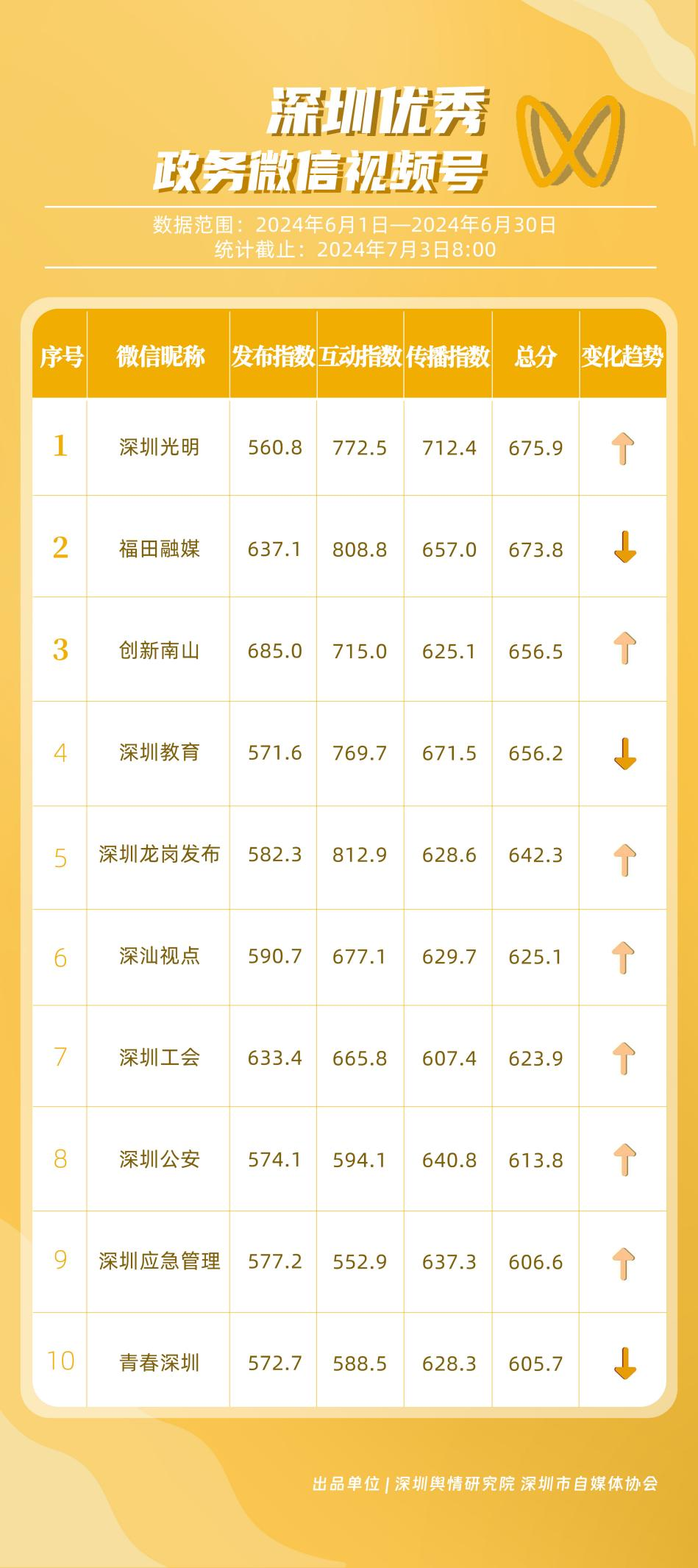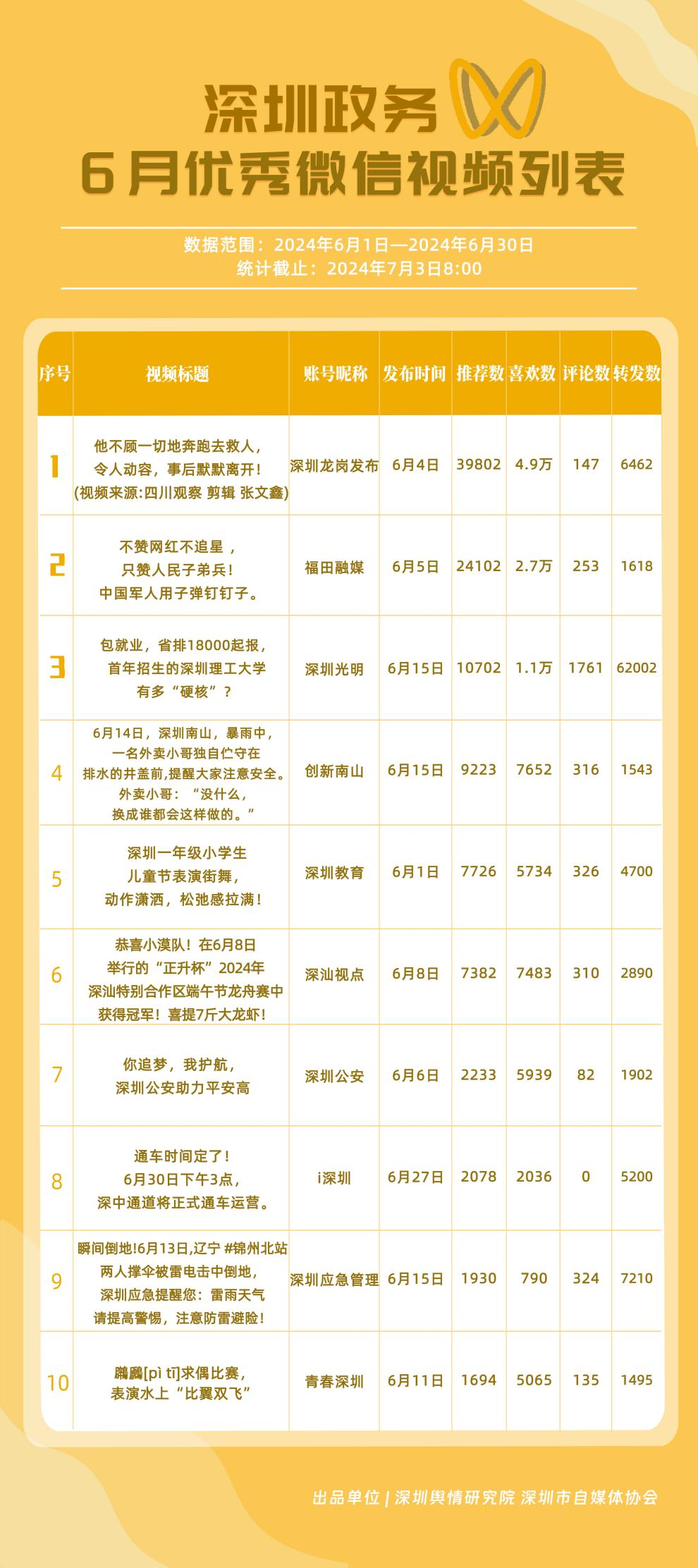 榜單在持續(xù)展示深圳政務(wù)新媒體矩陣建設(shè)成效的同時(shí),梳理總結(jié)了深圳政務(wù)微信公眾號、微信視頻號、微博號、抖音號、頭條號的運(yùn)營方法與經(jīng)驗(yàn),是政務(wù)公開、回應(yīng)群眾關(guān)切的重要載體。6月,又有哪些政務(wù)新媒體取得優(yōu)異成績呢?《深圳優(yōu)秀政務(wù)新媒體矩陣》(2024年6月期)邀您共同關(guān)注。